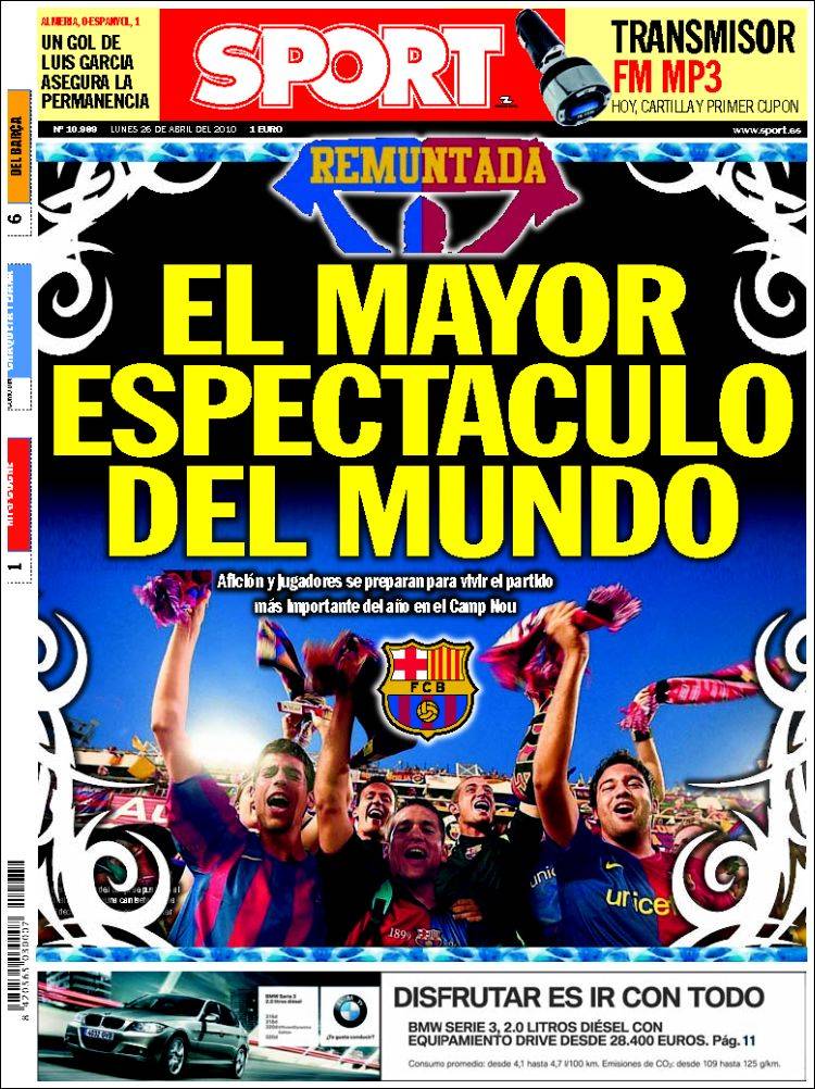 Anche su Sport si parla costantemente del ritorno delle semifinali di Champions League con il Barcellona di Guardiola che è pronto a rimontare il tre a uno subito all’andata dall’Inter di Mourinho. Su tutti i quotidiani catalani il comune denominatore è la parola rimonta pronunciata anche da tutti i giocatori del Barcellona che sono certi di poter capovolgere il risultato.