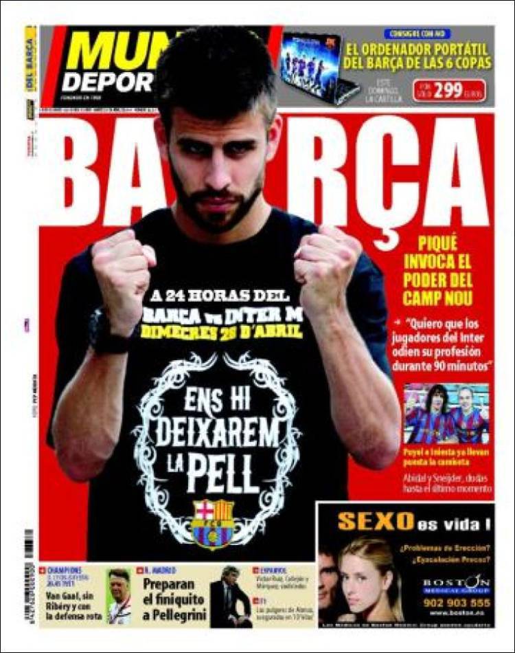 Sul primo quotidiano catalano Mundo Deportivo ci sono le dichiarazioni del difensore spagnolo Piquè che ieri ha usato toni forti per caricare la squadra blaugrana: “I giocatori dell’Inter odieranno questo sport per novanta minuti”. Al Camp Nou mercoledì sera la formazione di Mourinho troverà un clima infuocato sia in campo che sugli spalti con lo stadio di Barcellona che segnerà il tutto esaurito.