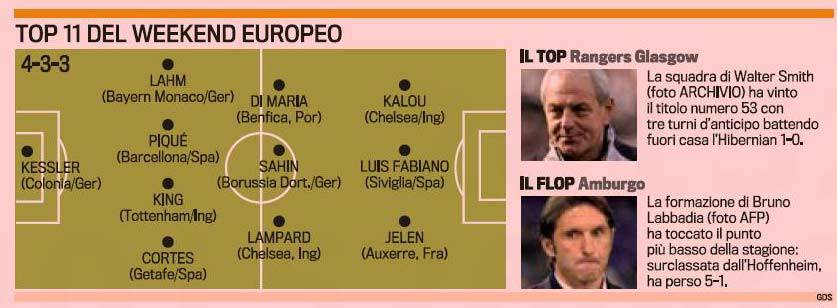 ROMA – Nella top 11 europea realizzata dai voti degli inviati della Gazzetta dello Sport ci sono grandi campioni come Puyol, Lampard, Luis Fabiano e giovani talenti come Di Maria. L’argentino del Benfica è nel mirino dell’Inter di Josè Mourinho che da almeno due anni segue la crescita del sudamericano. Anche se la concorrenza per il giocatore è notevole. Ecco la formazione.