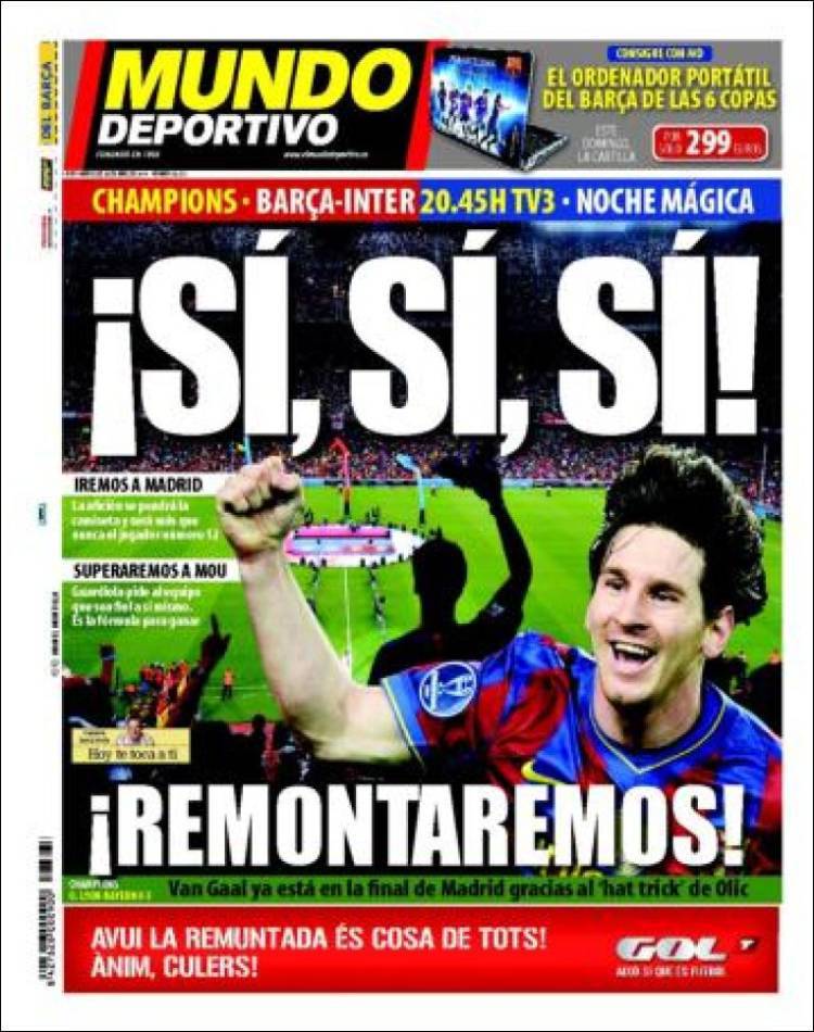 Il quotidiano catalano Mundo Deportivo ripete la solita “canzonetta” parlando di rimonta. Chiaro il riferimento al match di questa sera tra Barcellona ed Inter gara di ritorno della semifinale di Champions League con i blaugrana che dovranno recuperare il tre a uno subito all’andata a San Siro. I giocatori di Guardiola potranno contare su un Camp Nou gremito.