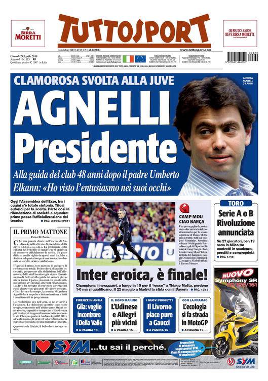 Tuttosport cambia completamente argomento e parla della nomina a presidente della Juventus di Andrea Agnelli, figlio del compianto Umberto. Il giovane rampollo della famiglia Agnelli è stato nominato direttamente dal patron bianconero Elkann. Ora per il futuro bianconero si parla di un nuovo assetto societario con Blanc amministratore delegato e forse con Marotta direttore generale.