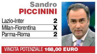 MILANO – Sandro Piccinini, telecronista Tv, attraverso le pagine del Corriere dello Sport fa un pronostico sulle partite più importanti di questa giornata di campionato. A giudicare dalla giocata, anche dopo questo turno l’ Inter resta sempre al comando con due punti di vantaggio sulla Roma mentre il Milan si allontana ancora di più dal secondo posto.