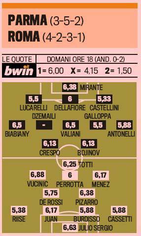 PARMA – Se la Roma vuole continuare a sognare lo Scudetto, deve assolutamente tornare alla vittoria contro il Parma e paradossalmente, sperare che la Lazio fermi l’Inter. Gli emiliani opporrano sicuramente una resistenza solida, condita dai soliti contropiedi guidati da Biabiany, Crespo e Bojinov. In attacco, per i giallorossi, l’unica punta sarà ancora il capitano Francesco Totti, supportato dal trio Vucinic, Perrotta e Menez. Ancora panchina per il bomber azzurro Luca Toni. Ecco le probabili formazioni secondo la ‘Gazzetta dello Sport’.