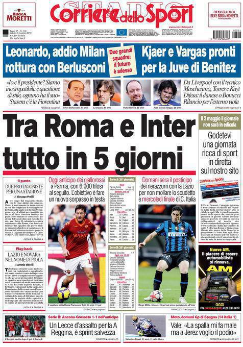Sul Corriere dello Sport si parla della solita sfida tra Roma ed Inter impegnate sia in campionato nella lotta scudetto con i giallorossi oggi impegnati sul campo di Parma mentre i nerazzurri domani giocheranno a Roma contro la Lazio. Non solo, perchè mercoledì sera ci sarà la finale di Coppa Italia tra le due formazioni, una sfida a tutto tondo che abbraccia più competizioni.