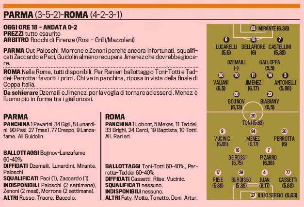 PARMA – Oggi pomeriggio Parma e Roma si affronteranno nell’anticipo pomeridiano della 36a giornata di campionato. Nei padroni di casa spazio al tandem d’attacco Biabany-Bojinov con Crespo in panchina pronto ad entrare, mentre nella Roma il tecnico Ranieri punta su Toni in attacco con Totti in panchina a riposo in vista della finale di Coppa Italia di mercoledì sera contro l’Inter. Ecco le formazioni della Gazzetta dello Sport.