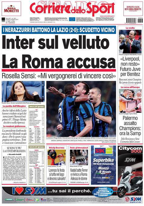 Sul Corriere dello Sport si parla della vittoria facile dell’Inter sul campo della Lazio che ha scatenato le polemiche di Rosella Sensi, presidentessa della Roma. La società giallorossa ha accusato i giocatori della Lazio di non essersi impegnati per contrastare il predominio dei nerazzurri, con l’intero stadio, compresi i tifosi biancocelesti, che tifavano per l’Inter di Mourinho.