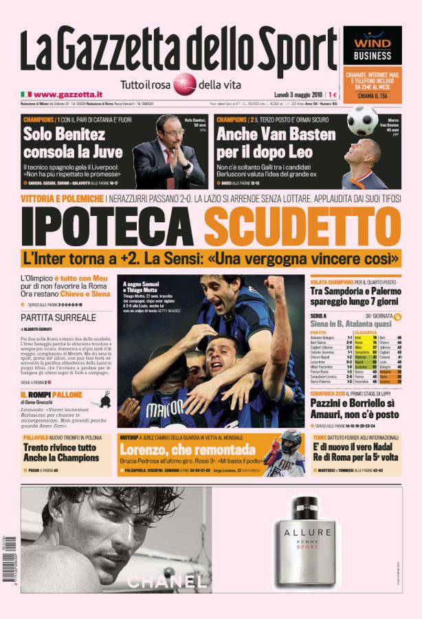 Sulla Gazzetta dello Sport si parla della vittoria dell’Inter contro la Lazio nella terz’ultima giornata di campionato che ha fatto ritornare i nerazzurri in testa alla classifica. Il match ha scatenato l’ira della Roma che ha parlato di una sconfitta per lo sport visto che i tifosi della Lazio in tribuna hanno esultato ai due gol dell’Inter, chiaramente contrari all’ipotesi di uno scudetto nelle mani giallorosse.