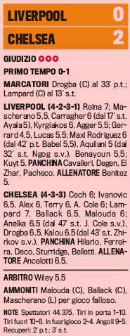 LIVERPOOL (Inghilterra) – Ancelotti (6,5) batte Benitez (5). Il Chelsea ha superato l’ostacolo Liverpool grazie ad una ottima prova di forza e mettendo una seria ipoteca sulla vittoria in Premier League ad una sola partita dal termine del campionato. Ecco le pagelle della ‘Gazzetta dello Sport’ sul big-match inglese che vede come migliore in campo tra i ‘Reds’ il portiere Reina, importante indice sull’andamento della partita. Bene Drogba, autore della prima rete, molto male Gerrard che con il suo scellerato retropassaggio ha aperto la strada alla vittoria dei ‘Blues’.