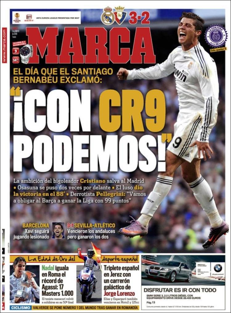 Il quotidiano madrileno Marca parla della vittoria casalinga del Real Madrid che vince per tre a due contro l’Osasuna grazie ad un gol di Cristiano Ronaldo nel finale del match. I tifosi del Bernabeu hanno gridato il nome del portoghese osannandolo come il salvatore. L’ex stella del Manchester United ha mantenuto i suoi compagni ad un punto dal Barcellona capolista che sabato sera ha vinto quattro a uno contro il Villareal.