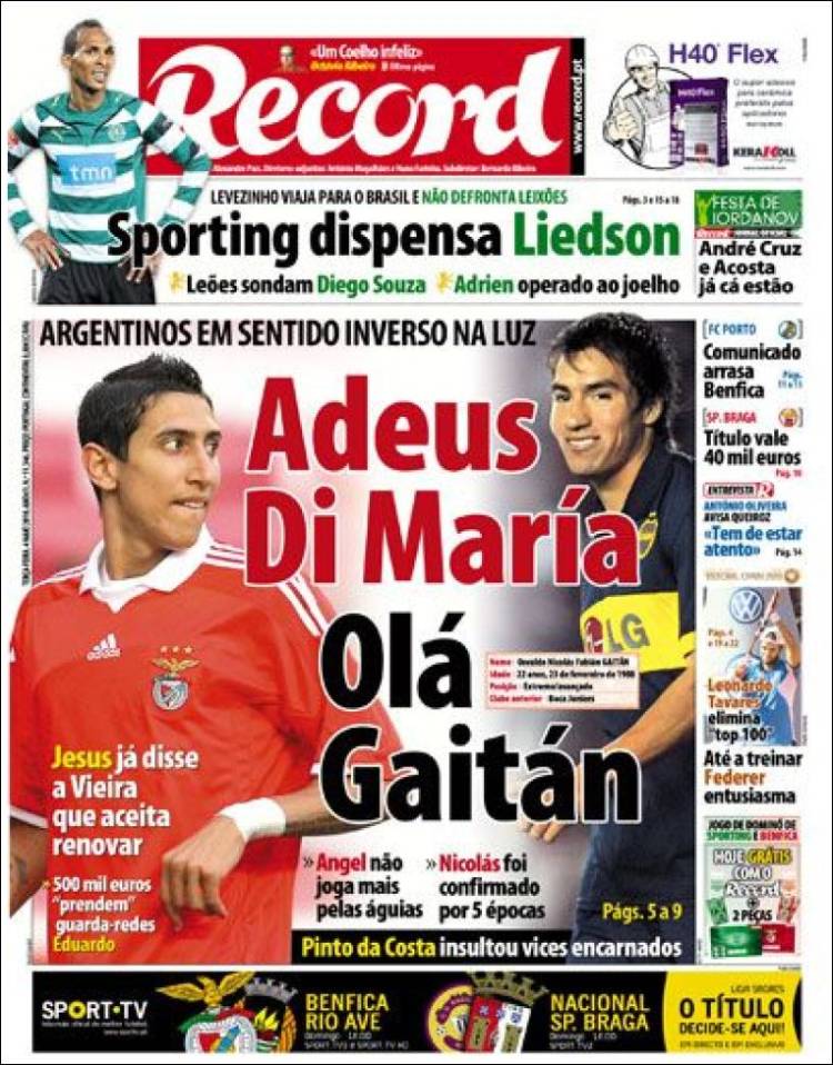 Il quotidiano portoghese Record parla di due operazioni di mercato del Benfica che a fine stagione saluterà il talento argentino Di Maria. Il giocatore è conteso dai migliori club europei tra cui l’Inter di Mourinho, anche se i portoghesi chiedono tanto. In arrivo c’è il giovane Gaitan, centrocampista offensivo del Boca Juniors, classe 88′, uno dei migliori talenti del Sudamerica.