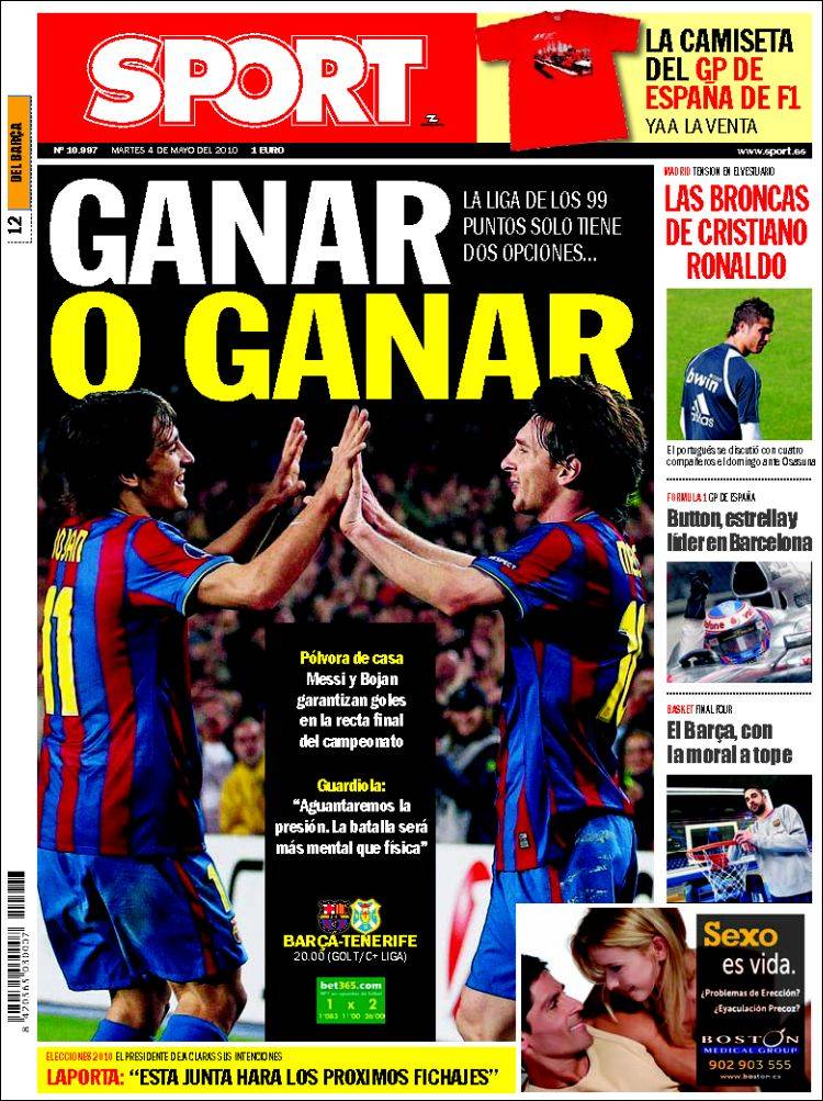Il quotidiano catalano Sport parla della Liga che vede il Barcellona in testa alla classifica con un punto di vantaggio sul Real Madrid. Per gli uomini di Guardiola c’è l’obbligo della vittoria in campionato dopo l’eliminazione dalla finale di Champions League per mano dell’Inter, per questo i quotidiani catalani spingono i blaugrana verso la vittoria in campionato.