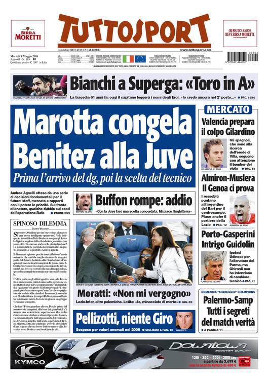 Il quotidiano torinese Tuttosport parla di un rallentamento nell’operazione che dovrebbe portare Benitez alla Juventus. La società bianconera prima ingaggerà Marotta come direttore generale e poi penserà alla scelta del tecnico. Il nuovo presidente Agnelli starebbe riflettendo sui costi per assicurarsi il manager del Liverpool Benitez e tutti i suoi collaboratori oltre ad una grande campagna acquisti.