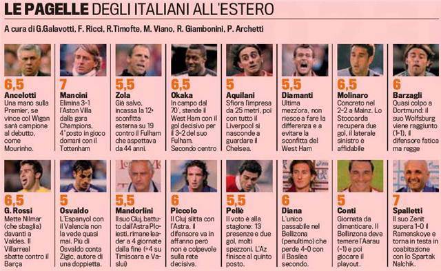 MILANO – Ecco la consueta panoramica della ‘Gazzetta’ sulle prestazioni dello scorso week end dei nostri connazionali, in giro per l’Europa: con le eccezioni di Mandorlini e Zola, i migliori sono gli allenatori. Tra i flop, nonostante sia in ripresa e sfiori il gol da cineteca contro il Chelsea, Aquilani: l’ex giallorosso paga la figuraccia dei ‘reds’ nella sfida contro i ‘blues’…