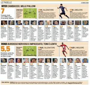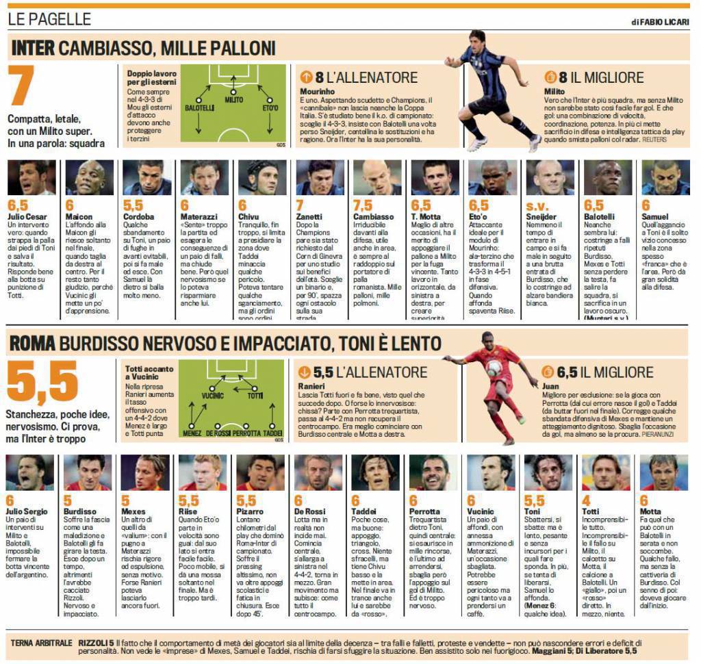 ROMA – La Gazzetta dello Sport ha assegnato i voti della finale di Coppa Italia tra Inter e Roma vinta dai nerazzurri per uno a zero grazie al gol di Milito, sempre più implacabile cannoniere. Nei nerazzurri oltre all’ex genoano grande partita di Cambiasso e Zanetti, mentre nella Roma Totti si becca un 4 in pagelle per il troppo nervosismo, mentre Burdisso e Mexes non ci sono.