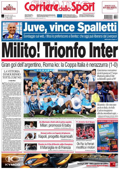 Anche il Corriere dello Sport parla della vittoria dell’Inter nella finale di Coppa Italia contro la Roma di Claudio Ranieri. I nerazzurri hanno giocato meglio dei giallorossi che non hanno saputo reagire al gol di Milito a fine primo tempo. Nel finale espulso Francesco Totti per un brutto pestone su Mario Balotelli. A fine gara la gioia di Josè Mourinho che in Italia ha praticamente vinto tutto.