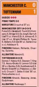 MANCHESTER (Inghilterra) – Niente da fare per Roberto Mancini, che aveva sognato il sorpasso e la realizzazione dell’obiettivo n°1 di quest’anno: il City perde lo scontro diretto con il Tottenham e saluta le speranze di 4° posto, che prenota invece la squadra di Redknapp, grazie al gol a 8 minuti dal termine di Crouch. Nell’altro recupero della 29a giornata di Premier, vittoria esterna dello Stoke sul campo del Fulham, ormai concentrato solo sulla finale di Europa League: