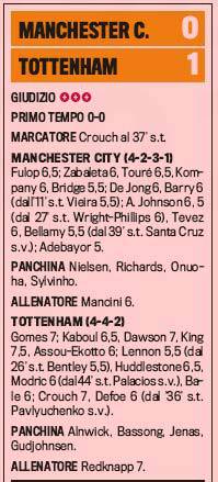 MANCHESTER (Inghilterra) – Niente da fare per Roberto Mancini, che aveva sognato il sorpasso e la realizzazione dell’obiettivo n°1 di quest’anno: il City perde lo scontro diretto con il Tottenham e saluta le speranze di 4° posto, che prenota invece la squadra di Redknapp, grazie al gol a 8 minuti dal termine di Crouch. Nell’altro recupero della 29a giornata di Premier, vittoria esterna dello Stoke sul campo del Fulham, ormai concentrato solo sulla finale di Europa League: