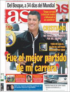 Sull’altro quotidiano madrileno As intervista esclusiva a Cristiano Ronaldo che è ritornato a parlare del match di qualche giorno fa contro il Mallorca vinto dal Real Madrid per quattro a uno grazie soprattutto alla sua tripletta. Il portoghese l’ha definita la miglior partita della carriera. In campionato il Real ha un solo punto di svantaggio dal Barcellona a due giornate dal termine.