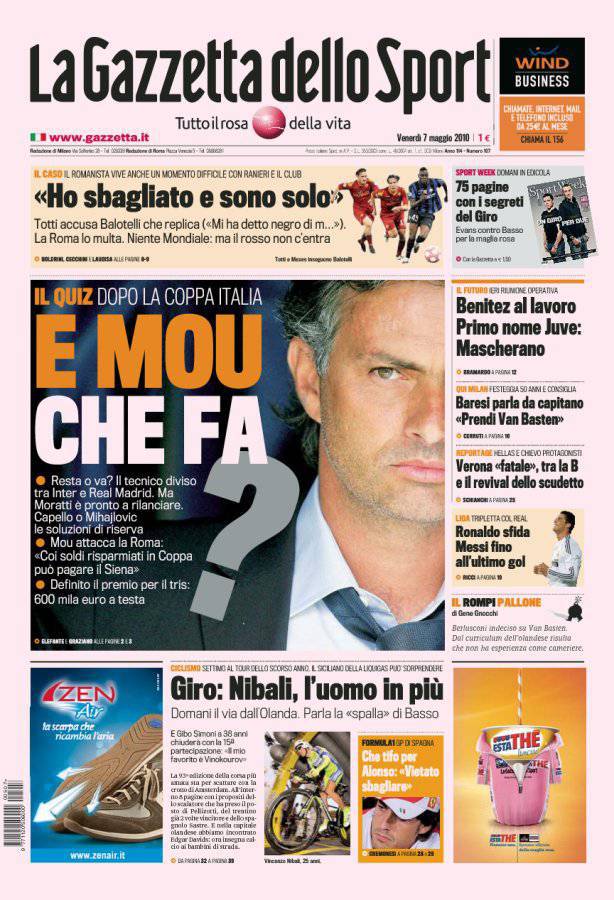 Sulla Gazzetta dello Sport si parla del futuro di Josè Mourinho, tecnico portoghese dell’Inter che piace al Real Madrid di Florentino Perez. Il presidente nerazzurro Massimo Moratti continua a tranquillizzare i tifosi ma ha già pronte due alternative: Fabio Capello, attuale c.t. dell’Inghilterra e Sinisa Mihajlovic tecnico del Catania. Intanto lo stesso Mourinho ha attaccato la Roma.