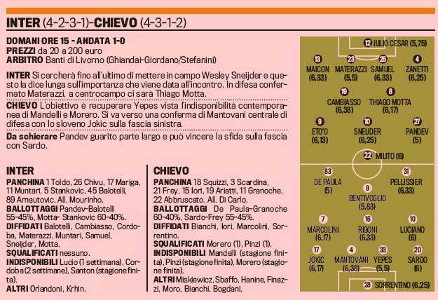 MILANO – La rifinitura odierna dirà qualcosa di più sulle reali possibilità di Wesley Sneijder di scendere in campo, domani, contro il Chievo. Mourinho cercherà di recuperare il fantasista olandese, fondamentale per il suo 4-2-3-1. La ‘Gazzetta’ crede nell’ipotesi e schiera proprio con questo schema i nerazzurri, alla vigilia del match: rilanciato titolare anche Pandev, che superati i guai fisici rientrerà nella linea a 3 dietro al ‘Principe’ Milito…