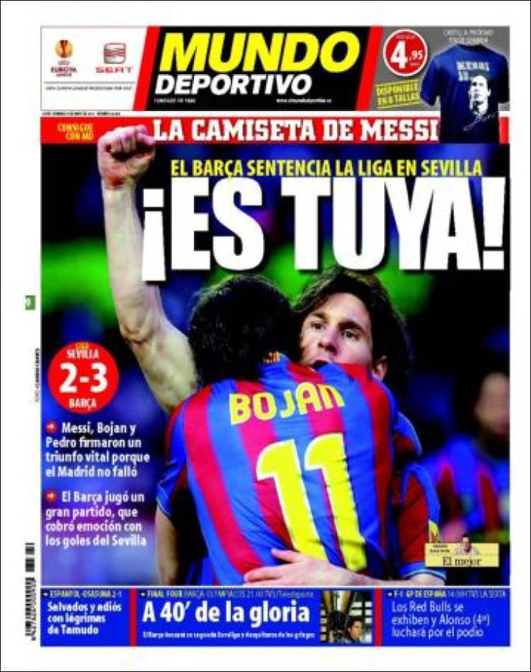 BARCELLONA (Spagna) – Il quotidiano catalano El Mundo Deportivo, molto vicino alle questioni di casa blaugrana, considera il tiolo spagnolo ormai del Barcellona. I catalani si sono imposti, sul campo del Siviglia, per 3-2, grazie alle reti di Lionel Messi, Bojan Krkic e Pedro Rodriguez. Il Barça è ora in testa con un punto di vantaggio sui rivali del Real Madrid.