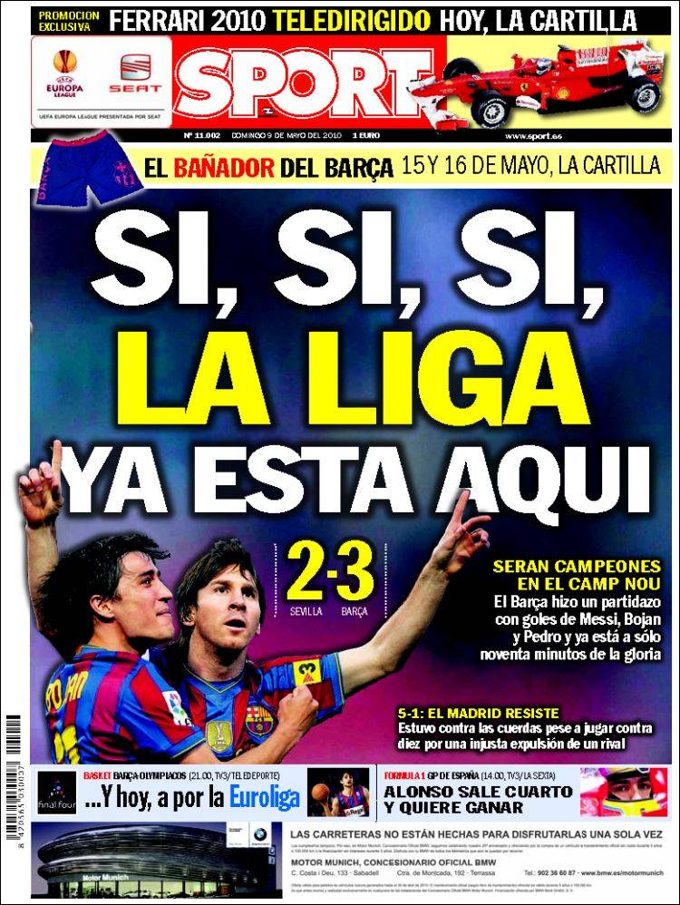 BARCELLONA (Spagna) – Il quotidiano spagnolo Sport, molto vicino al Barcellona, celebra la vittoria dei blaugrana contro il Siviglia per 3-2 grazie a Bojan Krkic, Leo Messi e Pedrito. I catalani sono ormai ad un passo dalla conquista del titolo, per il secondo anno consecutivo, dopo la conquista del Triplete lo scorso anno. Resiste, comunque il Real, che vince per 5-1 contro l’Athletic Bilbao.