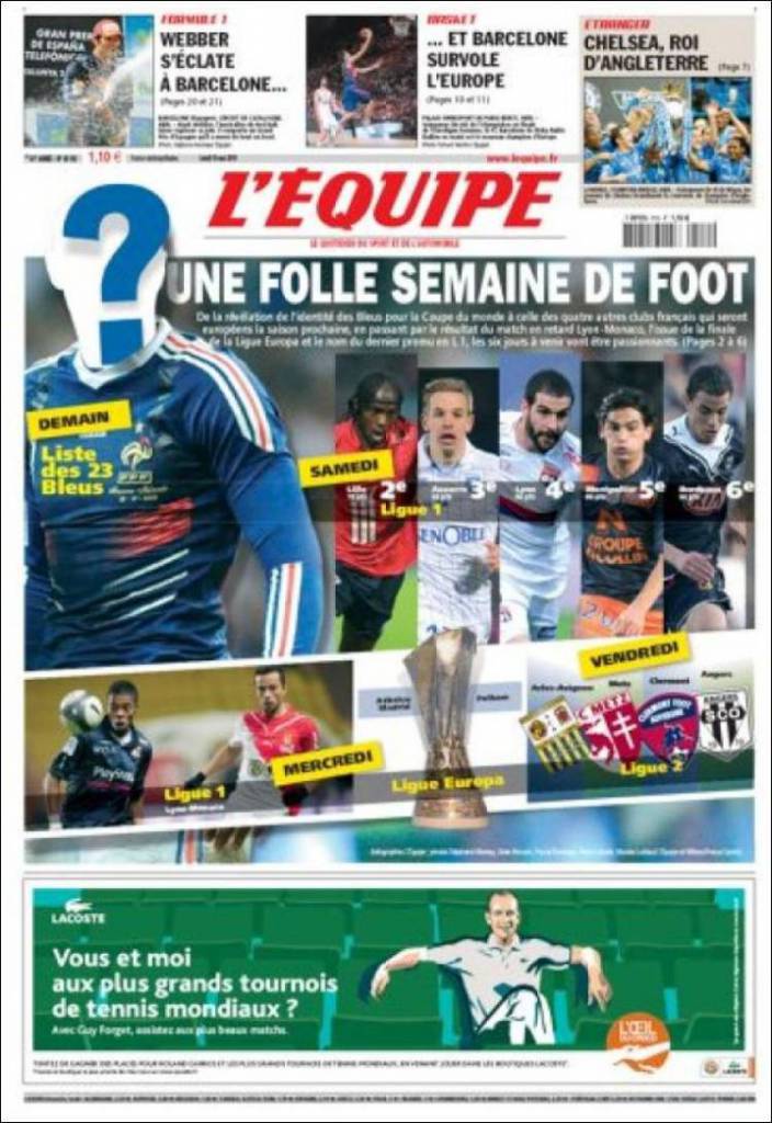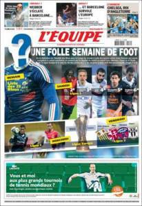Sul quotidiano francese L’Equipe si parla della settimana importante per il calcio francese. Domani il c.t. Domenech dovrebbe stilare la lista dei 23 giocatori della Francia che parteciperanno ai prossimi Mondiali sudafricani, mentre mercoledì ci sarà l’importante match di campionato tra Lione e Monaco. Sempre mercoledì finale di Europa League tra Atletico Madrid e Fulham, venerdì spazio al campionato di seconda divisione francese e sabato nuovamente Ligue 1 per assegnare gli ultimi posti Champions.