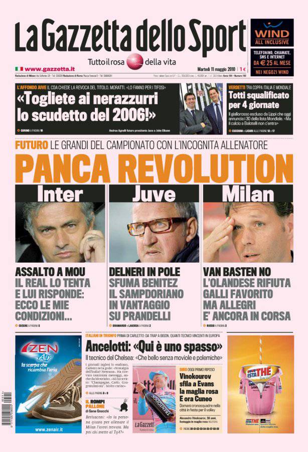 Sulla Gazzetta dello Sport si parla della possibile rivoluzione sulla panchina delle tre Big d’Italia, Inter, Milan e Juventus. I nerazzurri temono di perdere Josè Mourinho che sembra allettato dalla proposta del Real Madrid, mentre i bianconeri sono pronti ad affidare la panchina a Del Neri. Nel Milan Van Basten si tira fuori ed in pole position c’è l’accoppiata Galli-Tassotti con Allegri secondo incomodo.