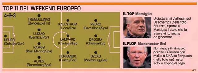 ROMA – Ecco la Top11 della settimana europea. L’allenatore è il rimpianto ex bianconero Deschamps, vincitore della Ligue1 con il suo Marseille. Le squadre più rappresentate sono Barcellona e Chelsea, con i grandi Alves e Pedrito per i blaugrana ed il duo Drogba – Lampard per i londinesi. La squadra ideale della Gazzetta dello Sport si schiera con un super offensivo 4-3-3. In porta il giovane tedesco Neuer, dello Shalke04; la difesa a 4 è composta da Alves e Tremoulinas come terzini e Ramos e Luisao centrali. Il centrocampo è di sostanza e fantasia, con Lampard, Kallstrom e Fernando. Il trio di attaccanti è di tutto rispetto: Drogba, Dzeko e Pedrito, un tridente da 100 goal!