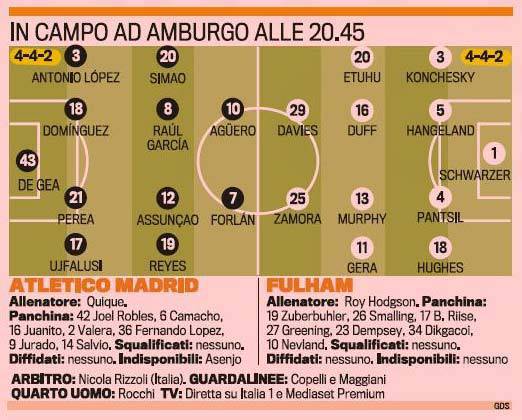AMBURGO (Germania) – Scenderanno in campo alle 20.45, per contendersi il primo trofeo internazionale, antipasto del gran gala di Madrid di sabato prossimo. Atletico Madrid e Fulham, dopo una cavalcata anche abbastanza sorprendente, si trovano stasera a giocarsi una stagione in 90′ (forse 120). Per entrambe le squadre, che hanno puntato tutto su questa competizione, è l’unico modo di ripagare i rispettivi flop in campionato. Ecco i probabili 22: