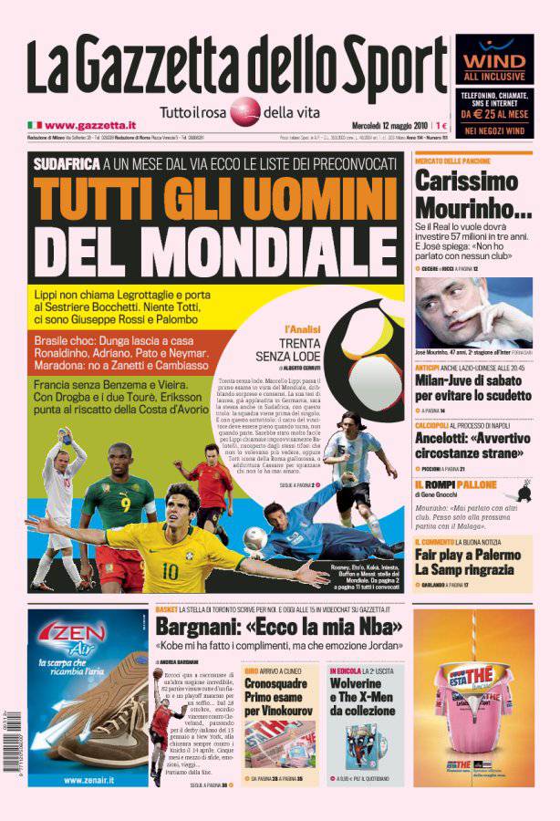 Sulla Gazzetta dello Sport si parla di Mondiale con i vari c.t. che hanno stilato la lista dei convocati per la manifestazione mondiale. Il c.t. dell’Italia Marcello Lippi ne ha convocati 30 che in seguito diventeranno 23, con le novità Giuseppe Rossi e Palombo e le assenze scontate di Miccoli, Cassano, Totti. Clamoroso nel Brasile dove Dunga non ha convocato Ronaldinho, Pato e Adriano, mentre Maradona ha lasciato a casa Zanetti e Cambiasso.