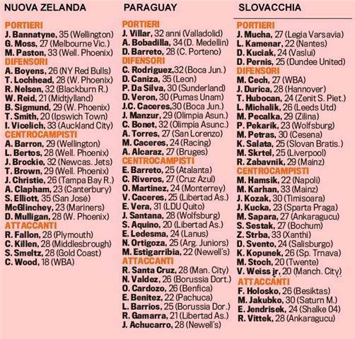 MILANO – Dalla Gazzetta dello Sport la foto con la lista dei convocati delle squadre inserite nel girone dell’Italia: Slovacchia, Paraguay e Nuova Zelanda. Gli Azzurri dovranno prestare particolare attenzione ad alcuni talenti di queste nazioni, dai conosciuti Hamsik e Santa Cruz, ai meno famosi Kucka, Nelsen, Santana, Cardozo e Rodriguez.