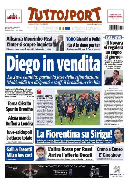 Sul quotidiano torinese Tuttosport si parla della possibile cessione di Diego. Il brasiliano della Juventus potrebbe non rientrare nei piani tattici e tecnici del probabile tecnico dei bianconeri Gigi Del Neri che da sempre predilige il gioco sulle fasce. In partenza dovrebbe esserci anche Buffon che è richiesto con insistenza dall’Arsenal di Wenger mentre si tratta per Ibrahimovic.