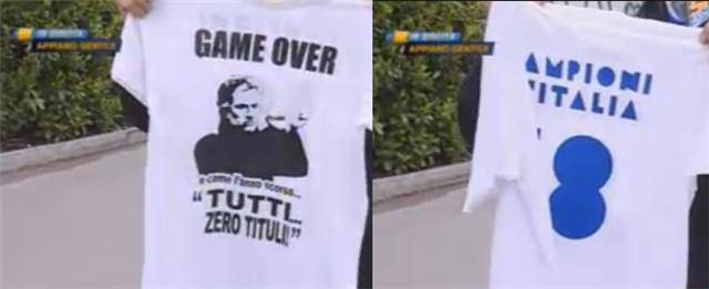 MILANO – Josè Mourinho ne ha combinata un’altra delle sue. L’allenatore dell’Inter, in corsa per vincere tutto e compiere un clamoroso ‘triplete’, ha pensato ad un’idea che farà discutere ma siamo sicuri che riscuoterà tendenza tra i tifosi nerazzurri. Il tecnico portoghese, infatti, ha pensato bene di prenotare da un venditore ambulante ad Appiano Gentile una maglia molto particolare. La maglia in questione riprende un po’ il motto della scorsa stagione, lo ‘zero tituli’ che tanto aveva esaltato gli interisti quanto ‘mortificato’ milanisti e juventini, sbeffeggiati dai tifosi nerazzurri. Ebbene, quest’anno Mourinho ha già pronta una nuova maglia per la vittoria dello Scudetto da esibire a Siena, con scritto dietro ‘Campioni d’Italia 18’ (tra l’altro sorpasso al Milan, fermo a 17 n.d.r.) e davanti un’immagine di Mou con scritto ‘Game Over, e come l’anno scorso anche quest’anno… TUTTI ZERO TITULI!’. Ecco una foto…
