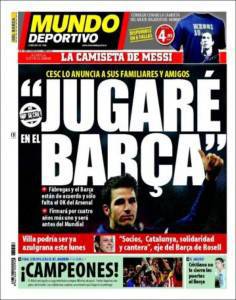 Sul quotidiano catalano Mundo Deportivo spazio alle dichiarazioni di Cesc Fabregas, centrocampista spagnolo dell’Arsenal che ha dichiarato la sua volontà di giocare nel Barcellona nella prossima stagione. Nel giornale si parla di un accordo già trovato tra l’iberico ed i catalani mancherebbe solamente l’ok definitivo dei “Gunners” anche se Wenger non vorrebbe cedere un pezzo da novanta.
