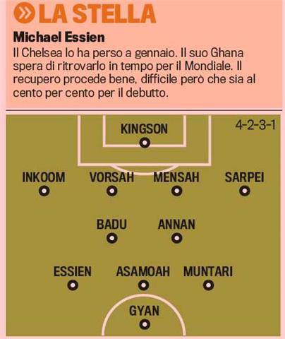 MILANO – Con la rassegna calcistica più importante a meno di un mese dal via, cerchiamo di saperne qualcosa di più sulle squadre che parteciperanno al Mondiale Sudafricano: ecco come giocherà, secondo le previsioni della ‘Gazzetta dello Sport’, il Ghana di Muntari e Essien. Proprio quest’ultimo, che ha saltato praticamente mezza stagione con il Chelsea, spera di recuperare e ritrovare un minimo di forma in vista di giugno: