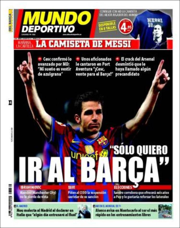 Sul quotidiano catalano Mundo Deportivo si parla di Cesc Fabregas, centrocampista spagnolo dell’Arsenal che ha dichiarato di voler giocare nel Barcellona dove è cresciuto prima di volare a Londra. Il giocatore iberico piace anche all’Inter di Mourinho ma l’intenzione di Fabregas è quella di vestire la maglia blaugrana. Ora bisognerà trovare l’accordo tra i catalani ed i londinesi.