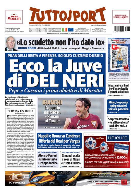 Anche Tuttosport apre con l’annuncio dell’ingaggio di Del Neri da parte della Juventus. Il tecnico della Sampdoria nella prossima stagione allenerà i bianconeri salvo clamorosi ripensamenti. La decisione verrà ufficializzata lunedì e si parla già di alcuni nomi per il calciomercato: in primis l’esterno d’attacco dell’Udinese Pepe e il terzino destro del Palermo Cassani, due calciatori scelti da Marotta.