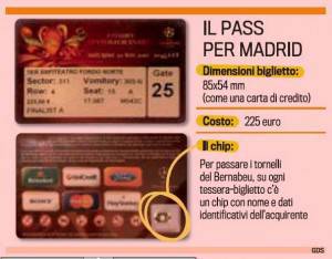 MILANO – In attesa della finale di Champions League tra Inter e Bayern Monaco, la Gazzetta dello Sport nell’edizione giornaliera ha riportato un’interessante immagine che ritrae il biglietto per l’entrare al Santiago Bernabeu di Madrid. Il biglietto è molto simile ad una carta di credito ed ha un chip nel quale sono segnalati il nome, il cognome e i dati identificativi dell’acquirente. Ecco il biglietto per la finale del 22 maggio.
