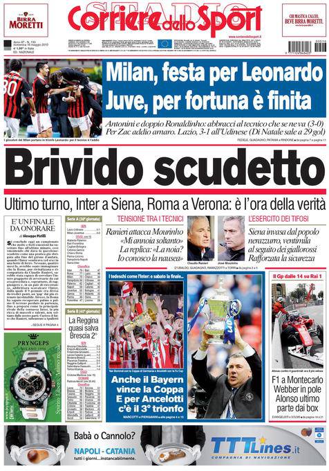 ROMA – Oggi ci sarà l’ultimo capitolo per l’assegnazione dello scudetto del campionato 2009-2010, ultimi brividi ed emozioni separano l’Inter o la Roma alla gloria. I nerazzurri sono impegnati a Siena con i toscani ormai retrocessi mentre la Roma dovrà giocare contro il Chievo già salvo. I campioni d’Italia in carica sono a 79 punti mentre i giallorossi sono a 77, in caso di parità lo scudetto andrà alla Roma per i scontri diretti a favore.