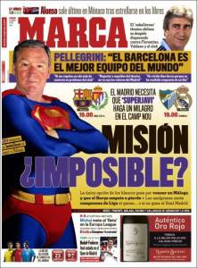 MADRID (Spagna) – Anche oggi ci sono sfide che decidono il campionato, come in Italia anche in Spagna il discorso scudetto è ancora apertissimo. Infatti come titola il quotidiano iberico Marca: Missione impossibile? E’ riferita al fatto che il Barcellona non deve vincere in casa contro il Racing Santander e il Real Madrid dovrebbe vincere contro il Malaga per essere campione di Spagna. Ce la faranno o no i Galcticos? In questi casi chi vivrà vedrà…