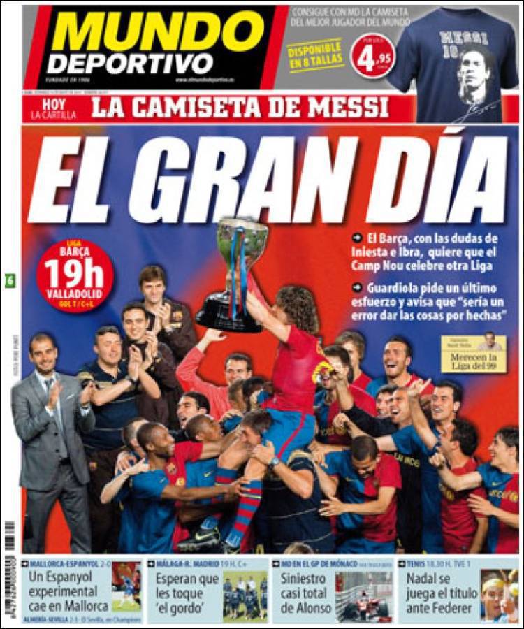 BARCELLONA (Spagna) – Oggi è il grande giorno come titola il Mundo Deportivo. Infatti oggi sono in programma Malaga-Real Madrid ed Barcellona-Racing Santander, due partite che decideranno le sorti di questo campionato spagnolo 2009-2010. Chiaramente è il Barcellona ad avere il pallino del gioco in mano visto che un’eventuale vittoria dei catalani manderebbee tranquillamente lo scudetto al Camp Nou senza neanche guardare il risultato del Real.