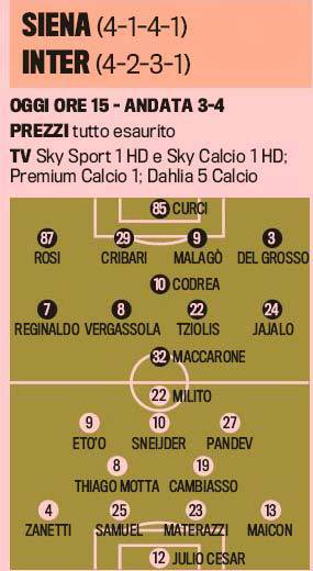 SIENA – Secondo la Gazzetta dello Sport, questo pomeriggio nella partita tra il Siena e l’Inter giocherà titolare l’attaccante macedone Goran Pandev. Partita fondamentale per lo scudetto da parte dei nerazzurri che affrontano il Siena ormai retrocesso in Serie B ma voglioso di fare bella figura contro la squadra finalista di Champions League e campione d’Italia in carica. Ecco a voi le probabili formazioni.