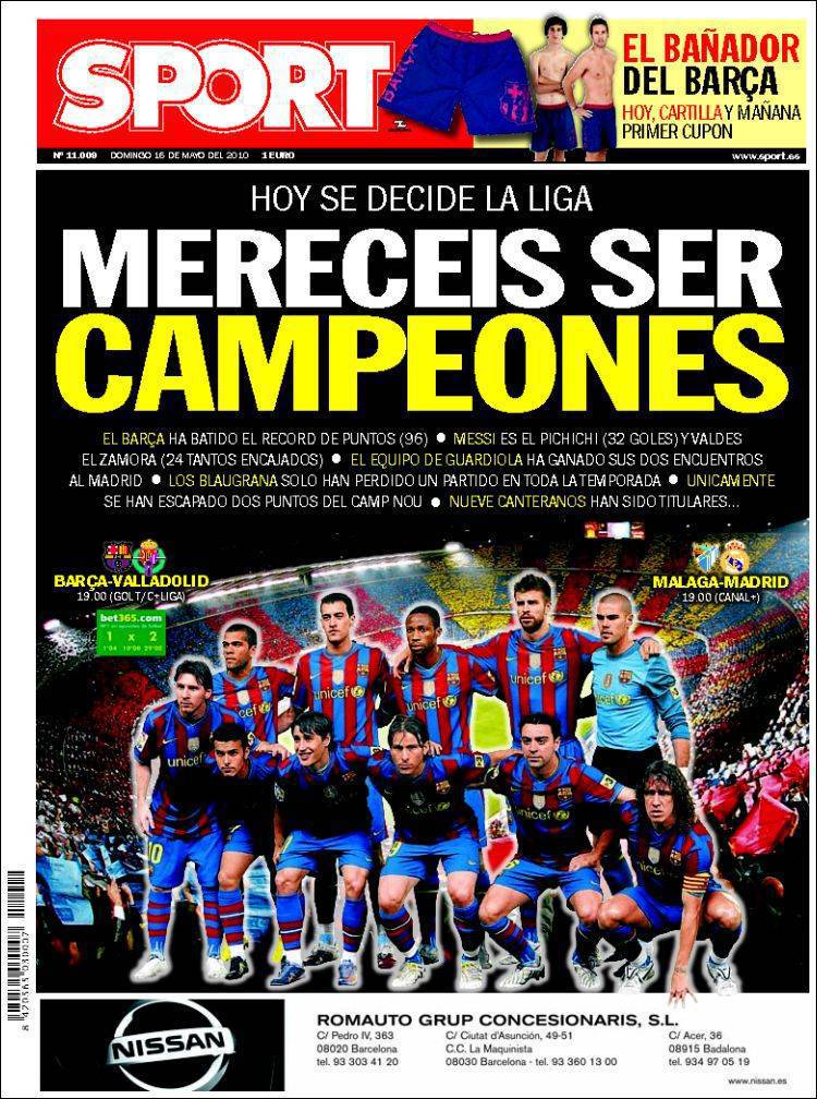 BARCELLONA (Spagna) – Il quotidiano iberico Sport incorona il Barcellona titolando la prima pagina del giornale oggi con scritto: “Meritano di essere campioni”, infatti i catalani hanno battuto tantissimi record in questa stagione, basti pensare che hanno perso una partita sola su 37 giocate. Trascinate anche da un Leo Messi in grande spolvero autore di 32 gol sono nella Liga.