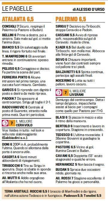 BERGAMO – Il Palermo riesce a battere l’Atalanta sul filo di lana per 2 reti a 1, ma non basta a centrare il 4° posto utile per approdare ai preliminari di Champions League. Tra i rosanero il migliore in campo è stato Liverani che ha dettato i tempi di gioco alla perfezione e ha avviato l’azione del primo gol. Per i bergamaschi il migliore è stato l’autore del gol Ceravolo, in campo come sostituto di Valdes. Bianco e Cassani i peggiori