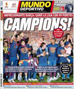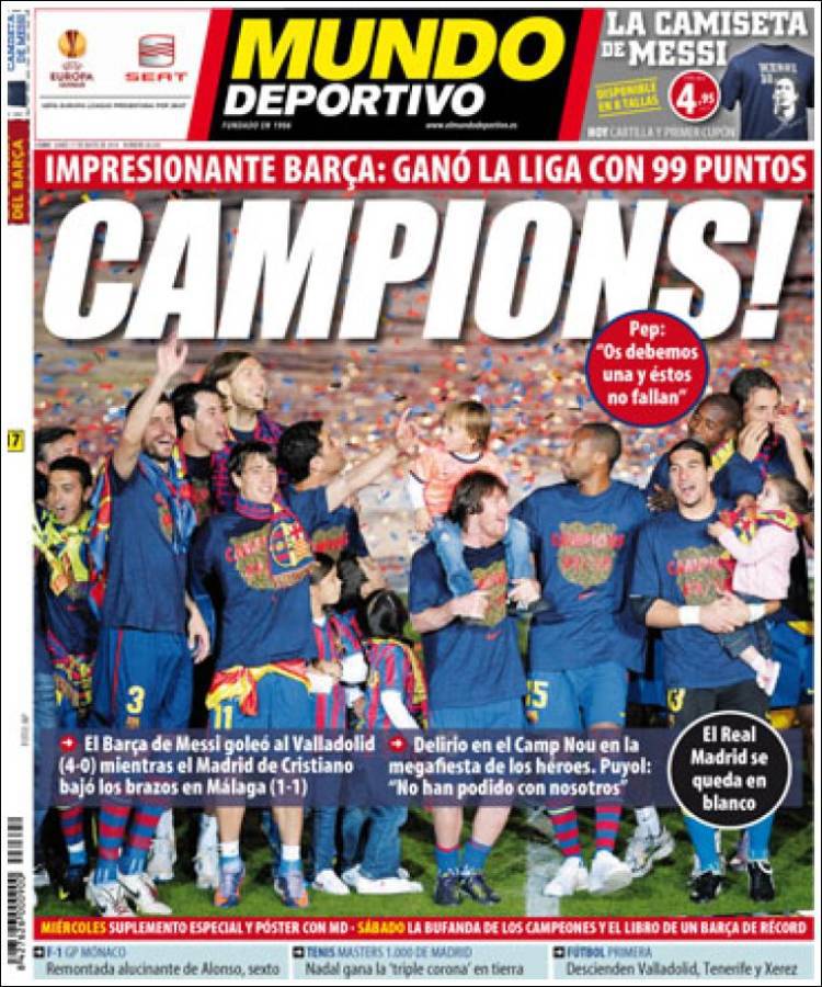 Il quotidiano catalano Mundo Deportivo celebra la vittoria della Liga da parte del Barcellona che ieri ha battuto il Valladolid quattro a zero laureandosi Campione di Spagna. Al secondo posto un Real Madrid deluso che non è andato oltre il pari nel match esterno contro il Malaga, finendo a tre punti dai catalani che hanno toccato quota 99 punti in classifica, un record.