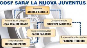 TORINO – Oggi il quotidiano Tuttosport ha riportato la foto del nuovo organigramma societario con l’arrivo del nuovo direttore generale Beppe Marotta. Al vertice della società il presidente Andrea Agnelli, stretti collaboratori l’amministratore delegato Blanc, il direttore generale Marotta. Quest’ultimo avrà a disposizione il Capo degli osservatori Fabio Paratici, insieme anche alla Sampdoria. Ecco la foto.