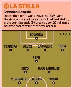 LISBONA (Portogallo) – La Gazzetta dello Sport ha riportato la possibile formazione del Portogallo di Carlos Queiroz. Ovviamente la stella indiscussa è Cristiano Ronaldo, giocatore del Real Madrid. In attacco c’è il brasiliano naturalizzato portoghese Liedson con Simao sulla sinistra. In difesa coppia centrale Alves e Carvalho, mentre a centrocampo spazio a Deco.