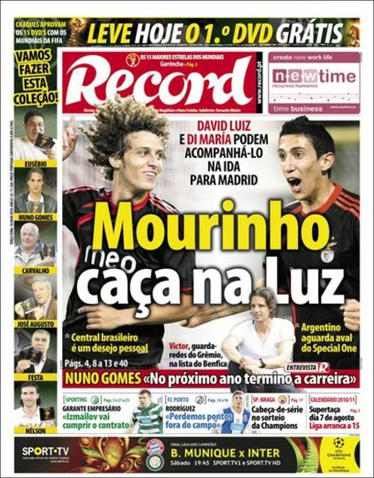 Il quotidiano portoghese Record parla del calciomercato del prossimo Real Madrid di Josè Mourinho. Il club madrileno sarebbe infatti interessato a due giocatori del Benfica, ovvero David Luiz e Angel Di Maria, entrambi nel mirino dello Special One. Il primo è un difensore brasiliano classe 87′ cercato dai maggiori club europei, mentre il secondo è un esterno offensivo argentino.