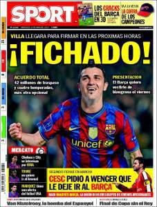 Sul quotidiano catalano Sport danno ormai per certo l’acquisto di David Villa da parte del Barcellona. Il centravanti del Valencia firmerà nelle prossime settimane il contratto che lo legherà alla formazione di Guardiola. Si parla di circa 42 milioni di euro che il Barcellona verserà nelle casse del Valencia. Ora il prossimo obiettivo è Fabregas dell’Arsenal anche se i londinesi proveranno a trattenere il giocatore.